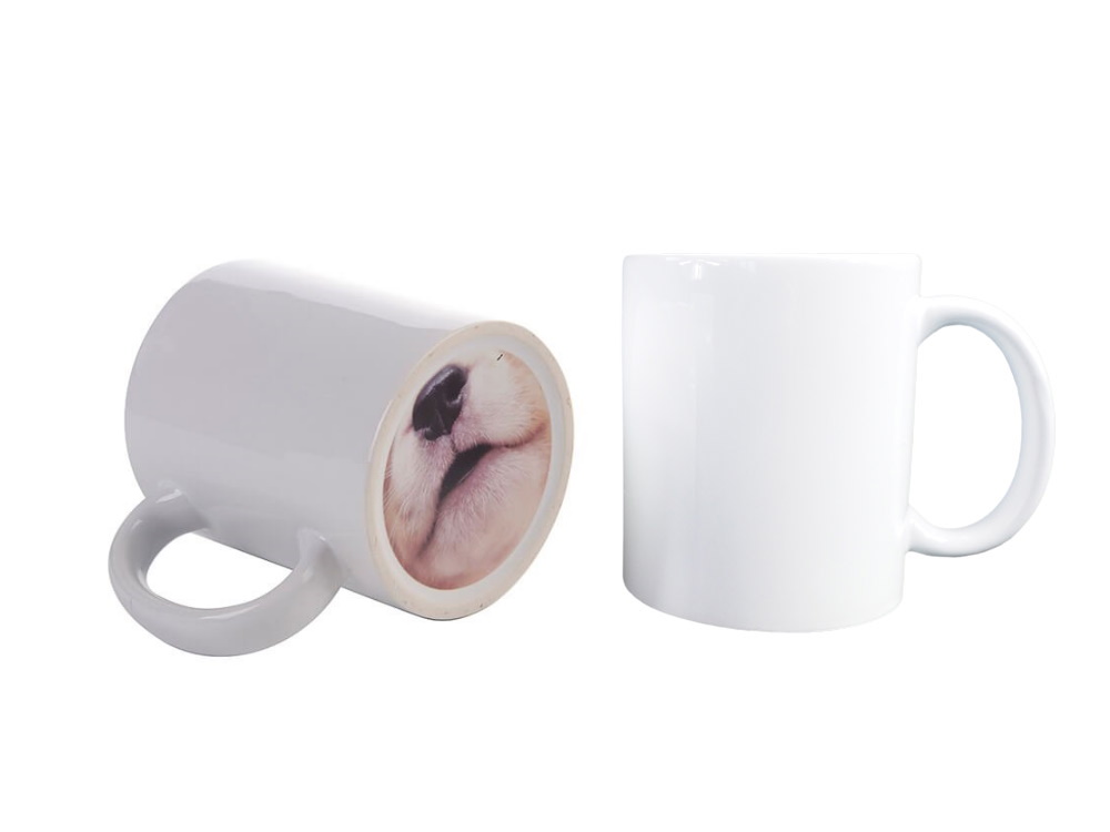 • Classic, white sublimation mug with a print on the bottom and a large, comfortable handle