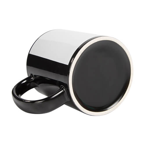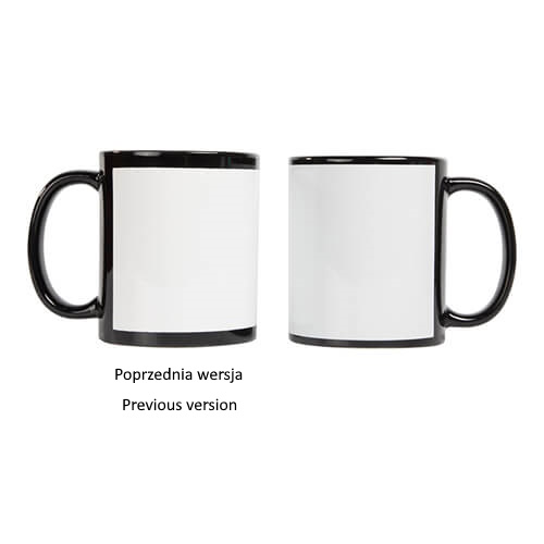 Black ceramic mug with white field for sublimation printout.