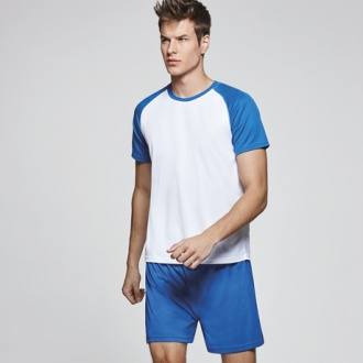 • the sports jersey has short, raglan sleeves in a contrasting color and a round, colored neckline with reinforced covered seams