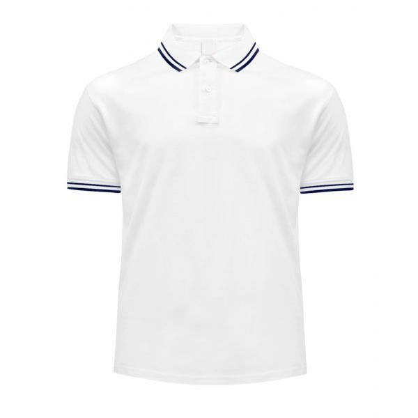 Men's polo shirt with short sleeves and a collar finished with a decorative ribbing with navy stripes. Elegant design of the polo shirt dedicated to golf courses, tennis matches, unofficial friendly meetings.