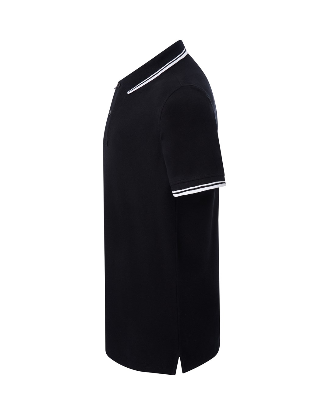 Men's polo shirt in black with short sleeves and a collar finished with a decorative ribbing with white stripes. Elegant design of the polo shirt dedicated to golf courses, tennis matches, unofficial friendly meetings.