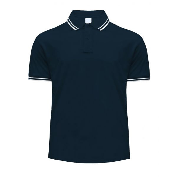 Men's polo shirt in navy blue with short sleeves and a collar finished with a decorative ribbing with white stripes. Elegant design of the polo shirt dedicated to golf courses, tennis matches, unofficial friendly meetings.