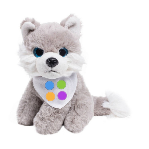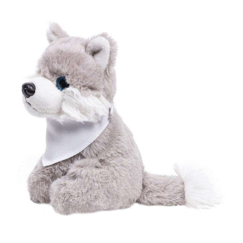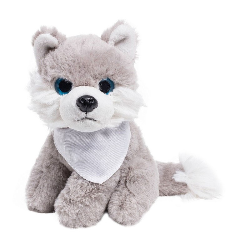 Mascot - a plush wolf with a white scarf for sublimation, mascot height: 14 cm, scarf dimensions: 5 x 2 cm.