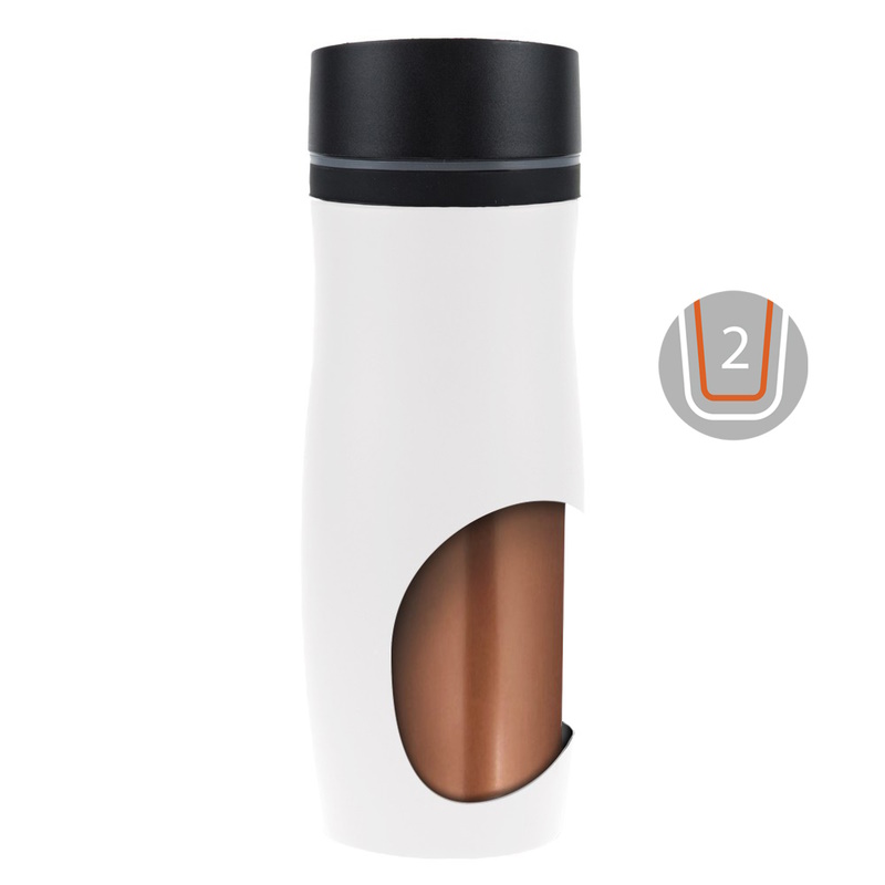 • The mug has a double wall made of stainless steel and copper vacuum insulation thanks to which, like a thermos, it keeps the temperature of the drink for a long time