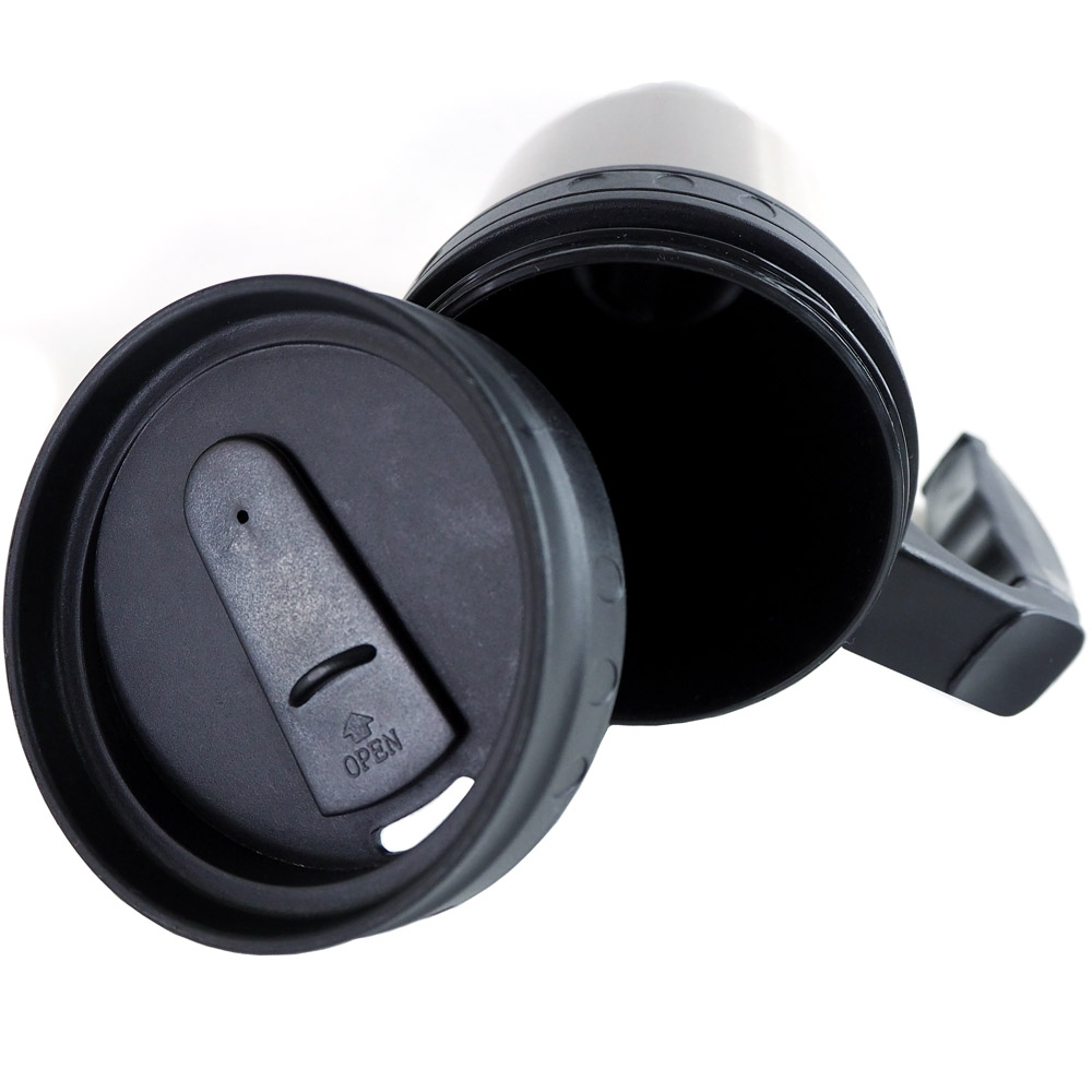 • The black plastic lid has a lockable (sliding) element that creates a drinking gap when needed