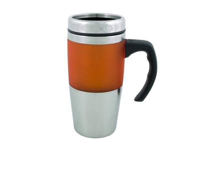 • A steel thermal mug with a handle and a lid