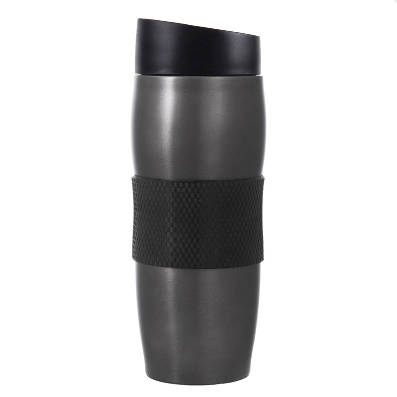 • The stylish thermo mug with a rubber insert is narrower at the base