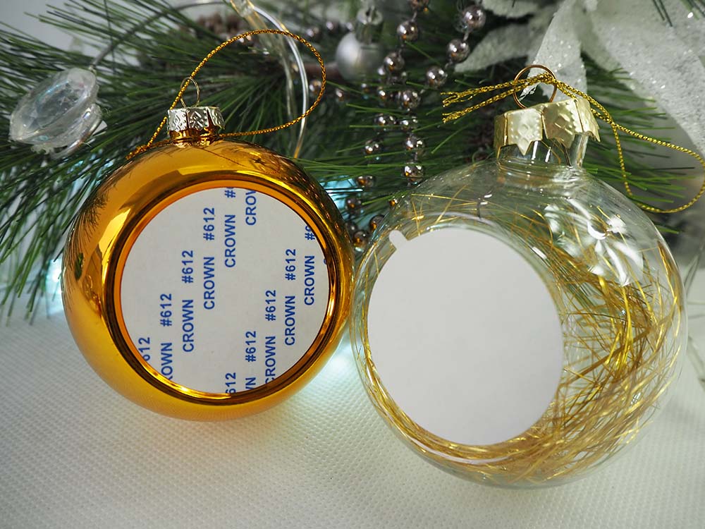 • We can make the sublimation print on a white plate, attached separately to the ball, and then stick it in the center of the designated field. There is a special adhesive tape on the bauble, secured from the outside. Just tear off the cover and stick the sublime disc