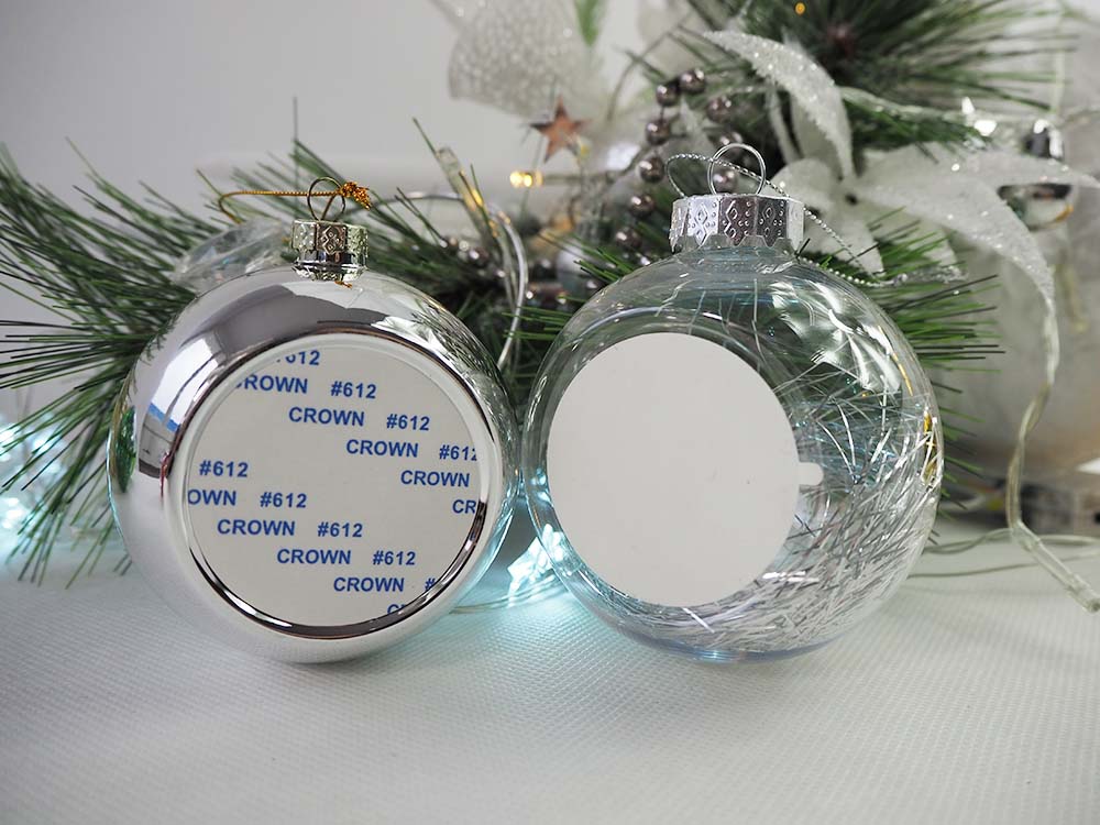 • We can make the sublimation print on a white plate, attached separately to the ball, and then stick it in the center of the designated field. There is a special adhesive tape on the bauble, secured from the outside. Just tear off the cover and stick the sublime disc